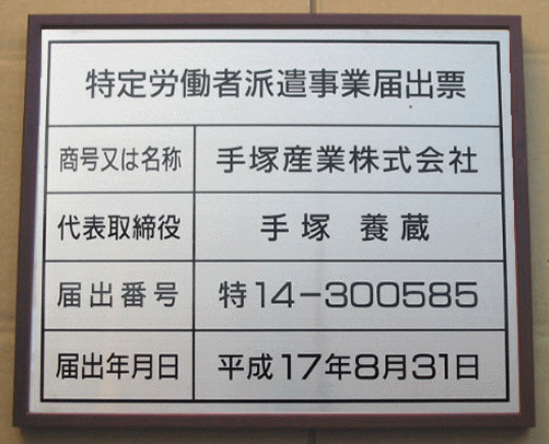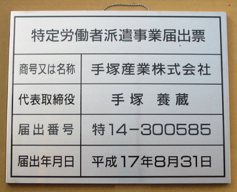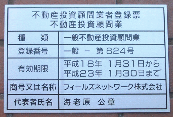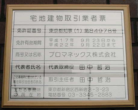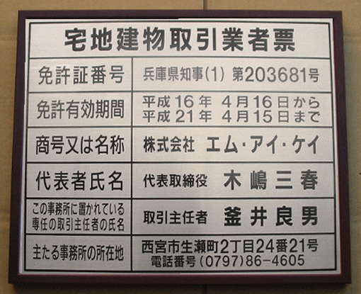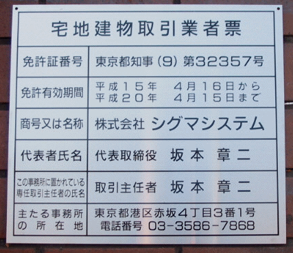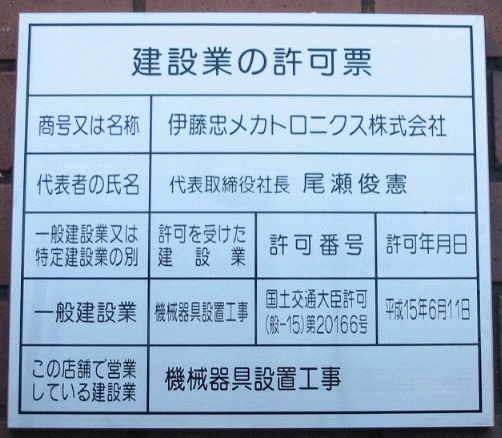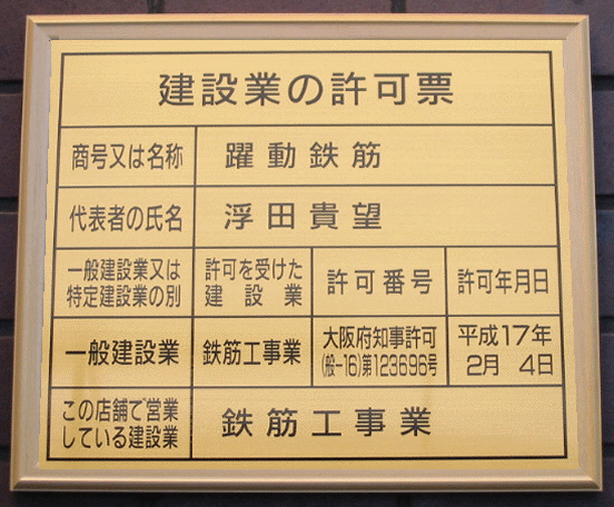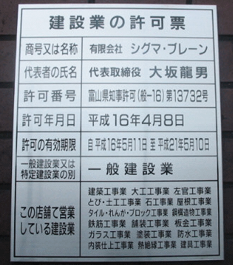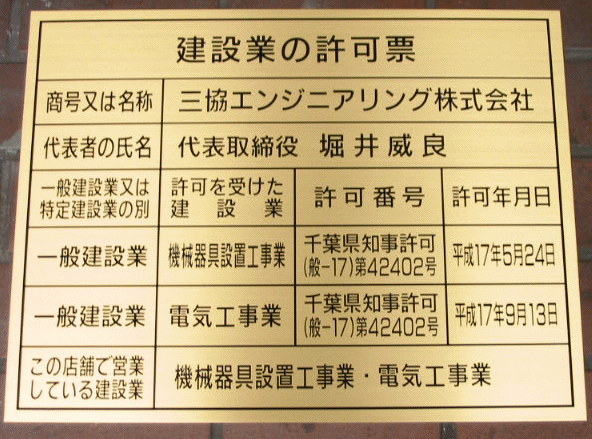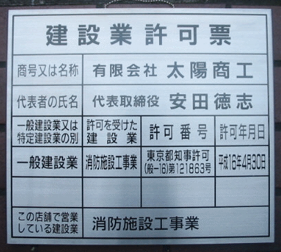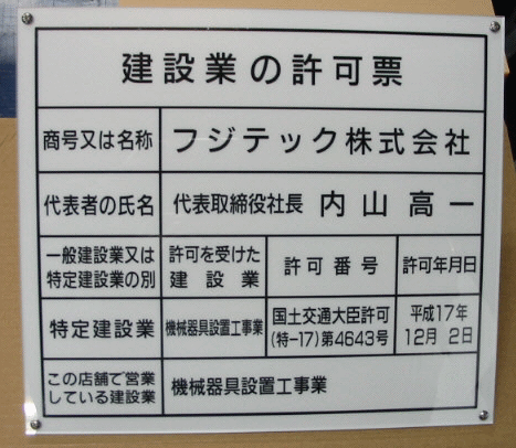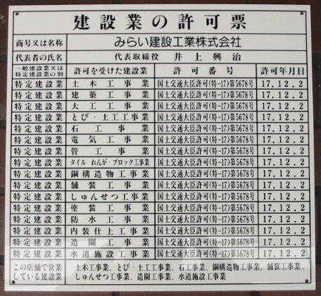 | 建設業の許可票 宅地建物取引業者票 登録電気工事業者登録票 一級建築士事務所登録票 投資顧問業者登録票 各種登録票 額縁付き建設業の許可票 ステンレス製建設業の許可票 のご用命は上記のFAX表かメールフォームでお見積もりを |